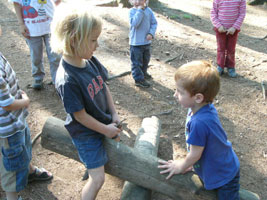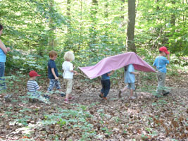 - eine Waldkindergarten-Gruppe das Miteinander fördert. Viele Aufgaben im Wald kann ein Kind nicht allein lösen: Einen schweren Ast herbeischleppen, eine glitschige Böschung erklimmen oder trockenen Fußes über einen Bach kommen.